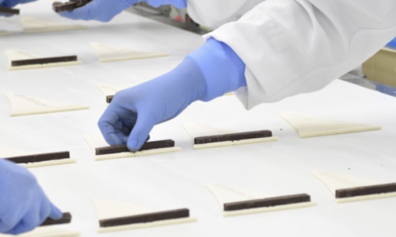 パンの種類によってはほとんど機械がパンの形まで成型を行いますが、パンにチョコレートやソーセージをのせ、それを包んだり、長さや重さ等の最終的な確認は、ヒトの手で行います。 -